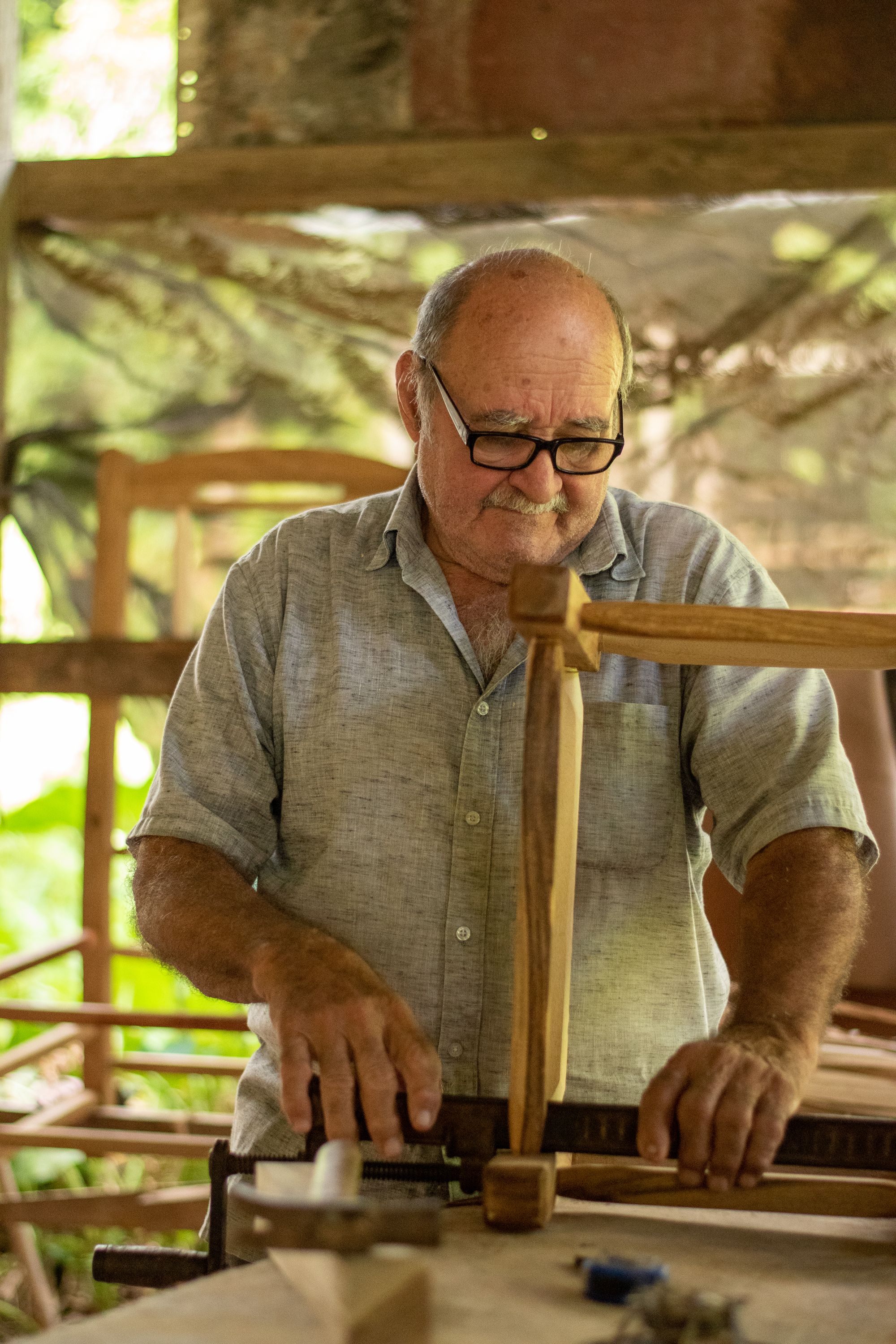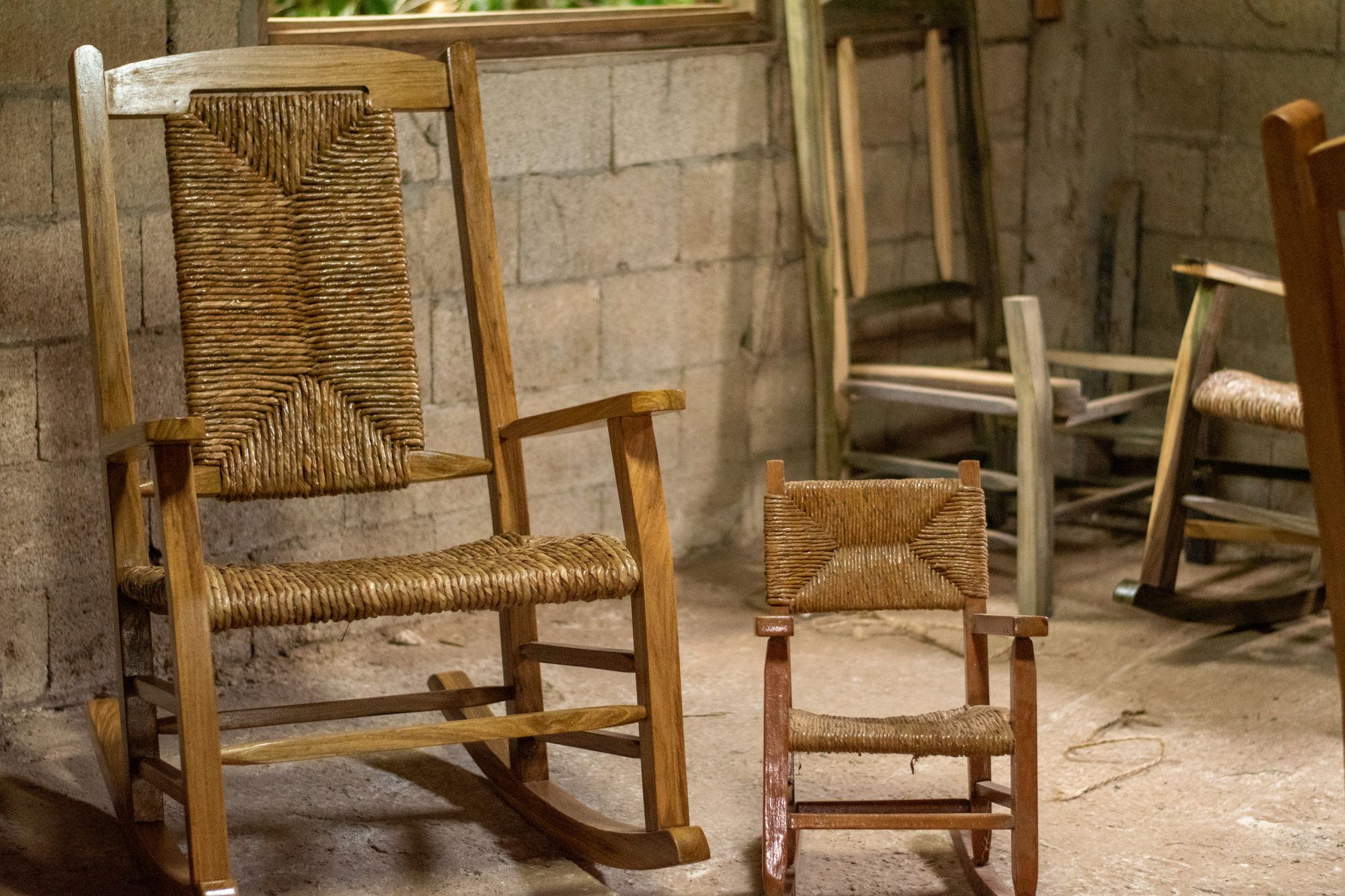 En cuanto a la madera, le toma más o menos 3 días en cortar y preparar todas las partes de madera, ensamblarlas y montarlas. Le toma un día tejerle la enea al mueble y ponerle los brazos y los balancines.
